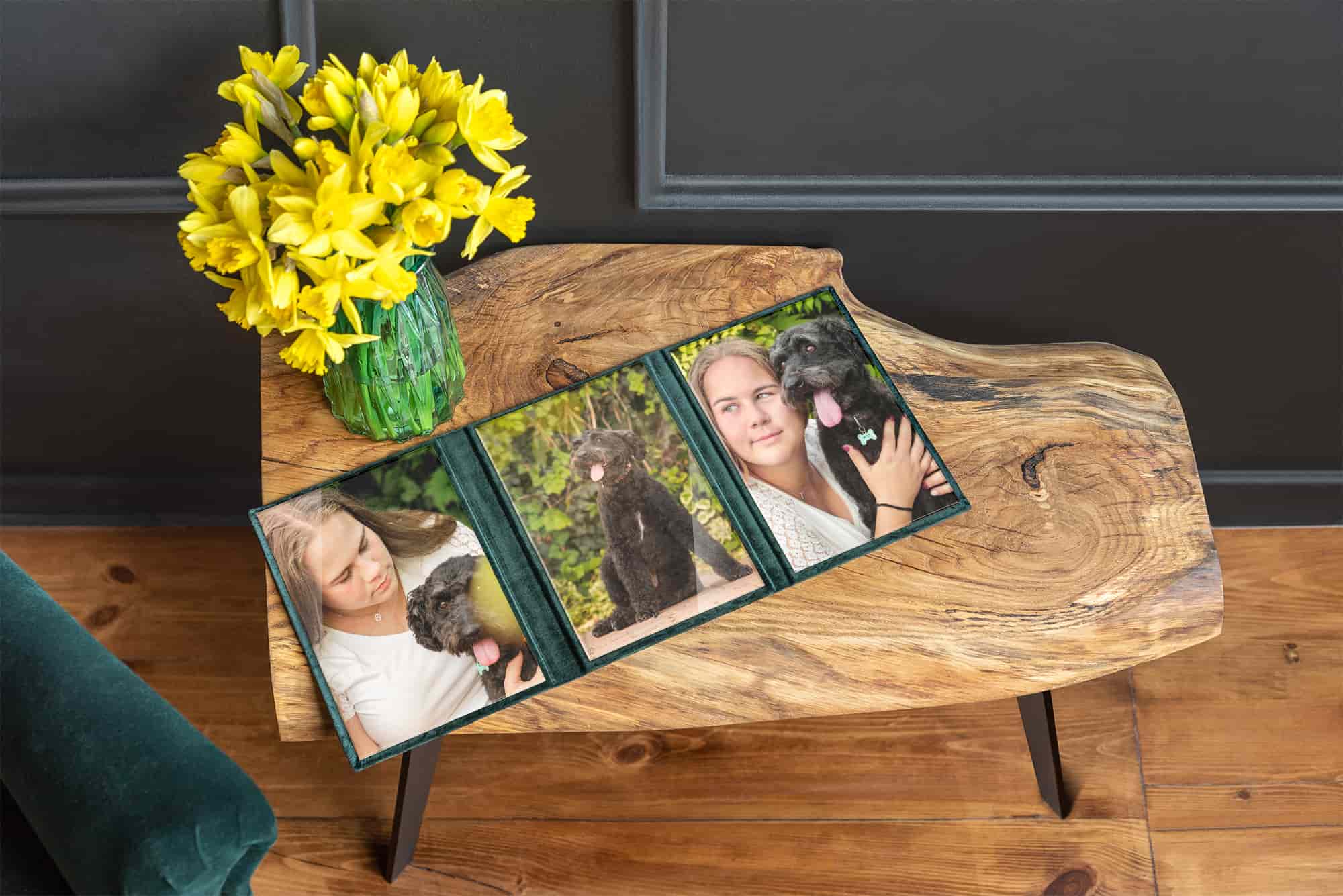 A fali kép és fotókönyv elegáns keresztezése. Három kép egy összehajtható albumban, ami kinyitva és összecsukva is a nappali díszeként őrzi a kutyusod „mancsnyomait”. A kollekcióban egy prémium minőségű fali képet is kapsz a szőrös fejű társadról. Ezek mellett gyűjteményben szereplő képek digitális negatívjait is hazaviheted.